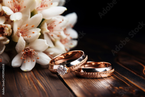 Rose gold wedding rings with orchid flowers on wooden surface, perfect for romantic and elegant celebrations
