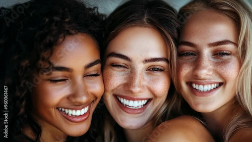 Close-up of three diverse women smiling with natural beauty, showcasing perfect skincare and anti-aging results