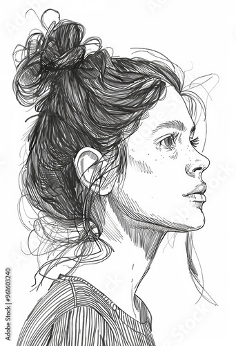 Line drawing sketch of an adult woman in side view with detailed hair and serene expression