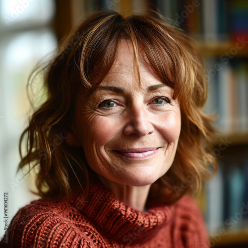Close-up portrait of a smiling British businesswoman in cozy office setting
