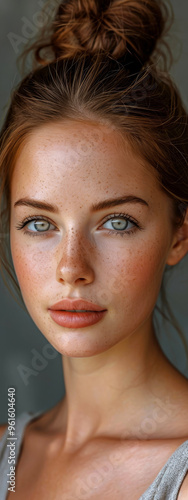 Close-up of a beautiful woman with clear blue eyes, light makeup, and natural freckles