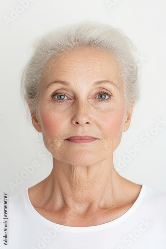 Studio portrait of an elegant older Eastern European woman with light skin, showcasing natural beauty and grace