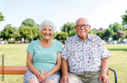 Happy senior couple sitting on a bench in a sunny park