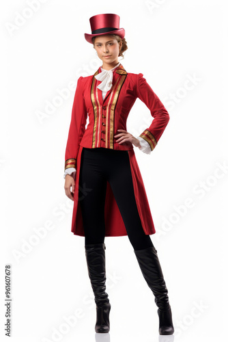 Smiling female ringmaster in traditional circus costume posing against a white background