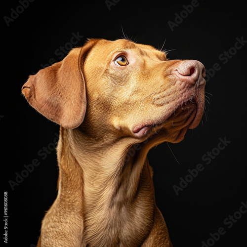 Vizsla dog portrait against a black background in studio setting