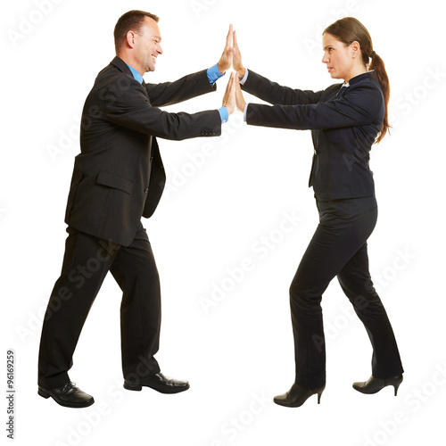 Mann und Frau drücken Hände gegeneinander