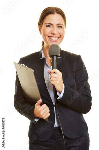 Journalistin mit Mikrofon und Klemmbrett macht Umfrage