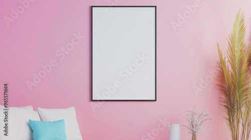 Chic living room interior with a minimalist poster frame on a pink wall, accompanied by cozy cushions and elegant decor elements