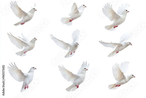 White doves flying in different directions on a white background