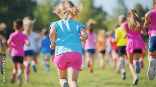 Rear view of children running and competing in a race, showcasing vibrant energy and enthusiasm in a sunny outdoor setting