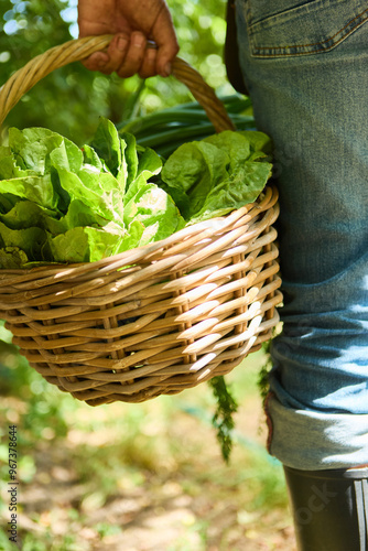Freshly harvested lettuce in wicker basket held by gardener in denim jeans