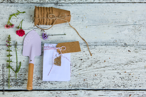 Gardening tools and materials with biodegradable pots, hand trowel, and seed packet on rustic wooden table