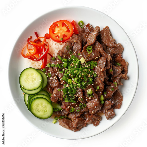 Top view of delicious bulgogi on a plate with garnishments, perfect for menu or culinary concepts
