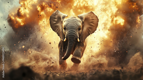 A cute baby elephant running energetically away from a dramatic explosion, creating a striking scene with a mix of humor and intensity.