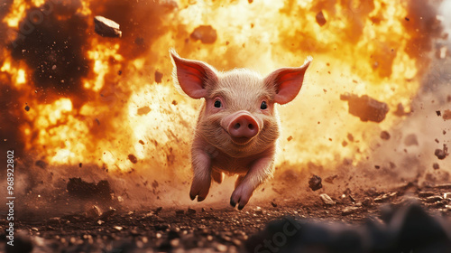A funny and cute piglet bravely running away from a massive explosion with fiery debris in the background, showcasing an adventurous and humorous scene.
