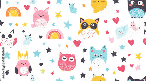 Seamless pattern with pastel-colored cute animals, hearts, and stars