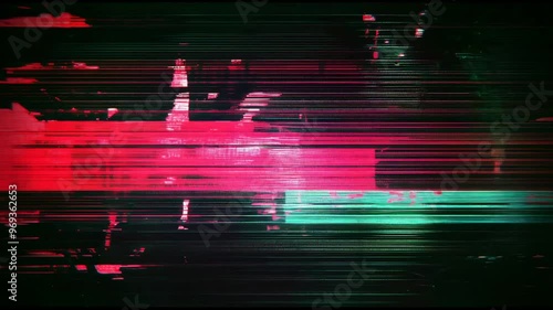 Abstract digital glitch with vibrant pink and green static lines creating a chaotic visual effect reminiscent of analog television noise