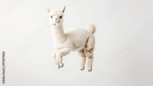 Cute alpaca floating in the sky on a white background, showcasing a whimsical and dreamy scene of an adorable creature in mid-air