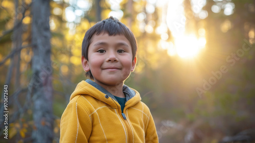 Portrait of a happy Indigenous Canadian child in nature with sunset