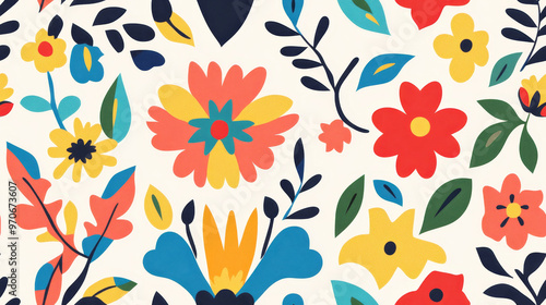 Seamless vibrant folk art inspired floral pattern design