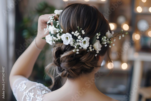 Hairdresser styling bridal hairstyle with flowers in an elegant updo