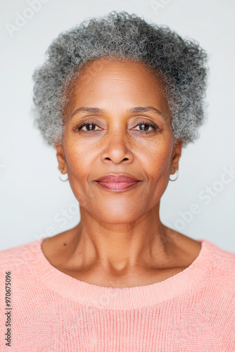 Elegant portrait of an older African-American woman with natural grey hair in a studio setting, showcasing beauty and confidence with a serene expression