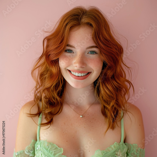 Smiling red-haired teenage model with vibrant curls, wearing a delicate green dress against a soft pink background, capturing a sense of joy and confidence.