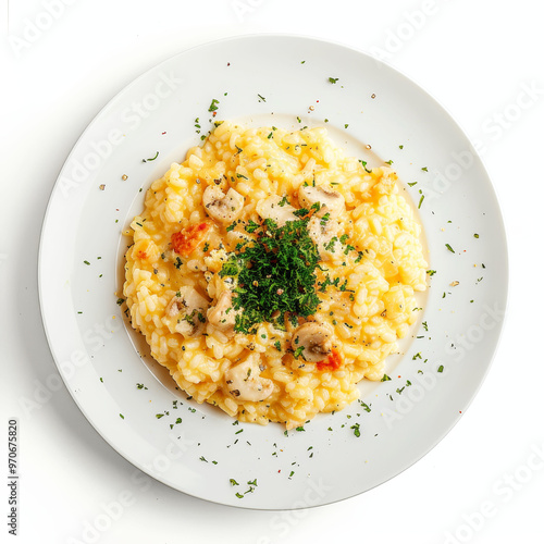 Vegetarian Paella with Peas and Bell Peppers, Fresh Parsley Top View
