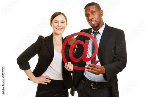 Geschäftsleute halten Daumen hoch und at-Zeichen