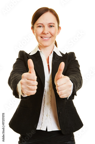 Erfolgreiche Geschäftsfrau hält beide Daumen hoch