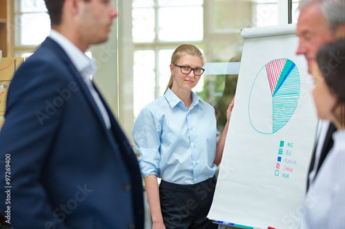 Business Team bei Präsentation um Flipchart
