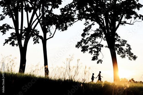 Senior couple holding hands and walking in the park at sunset surrounded by nature's beauty and tranquility