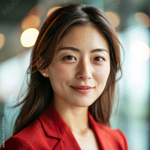 Close-up portrait of smiling mature Asian businesswoman in office setting