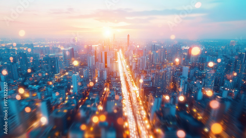 Aerial view of a futuristic smart cityscape showcasing digital transformation and urban development in a modern metropolis at dusk