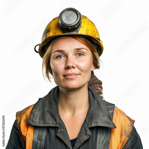 Portrait of a female coal miner with safety helmet and headlamp on white background