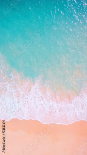 Aerial view of a serene paradise beach with turquoise waters and gentle waves meeting soft sandy shores