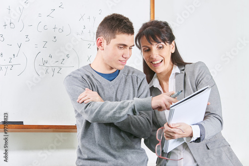 Frau als Lehrer hilft Schüler im Mathematik Unterricht