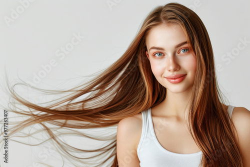 Beautiful woman with radiant, healthy long hair in motion, showcasing vitality and elegance against a simple background