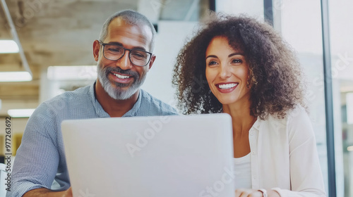 Business team of two happy professionals working together on a laptop in a modern office environment, showcasing collaboration and success.