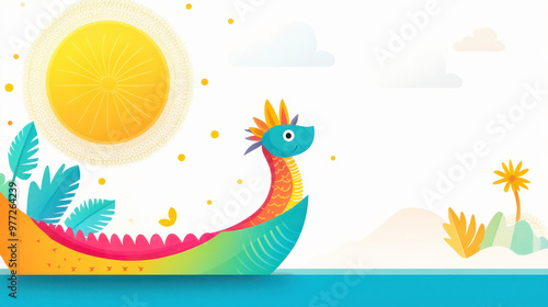 Colorful illustration of a traditional boat race during the vibrant Onam festival under a sunny sky with lush green leaves.