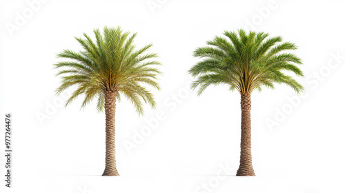 Frontal view of two Phoenix dactylifera date palm trees showcasing the lush green fronds against a pristine white background.