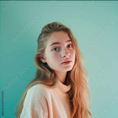 Candid portrait of a curious early teen with long blond hair, conveying innocence and curiosity against a light blue background.