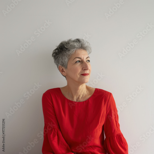 Contemplative Caucasian woman in her 60s with short gray hair wearing a red dress, looking thoughtful against a white background