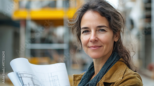 Portrait of confident young female architect standing with blueprint and laptop at desk in incomplete house