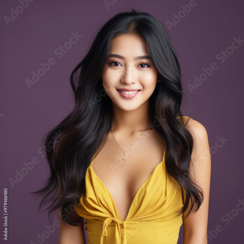 A young girl with long black hair in a pink dress, smiling warmly against a light background