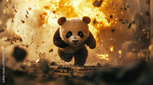 Adorable baby panda running energetically away from an explosive background, creating a humorous and dynamic scene full of action and cuteness.