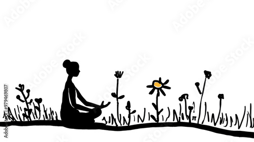 Silhouette of a young woman meditating outdoors at sunrise, surrounded by flowers and nature in a tranquil setting