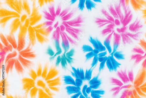 Seamless tie-dye pattern with vibrant yellow, pink, and blue colors creating an intricate design