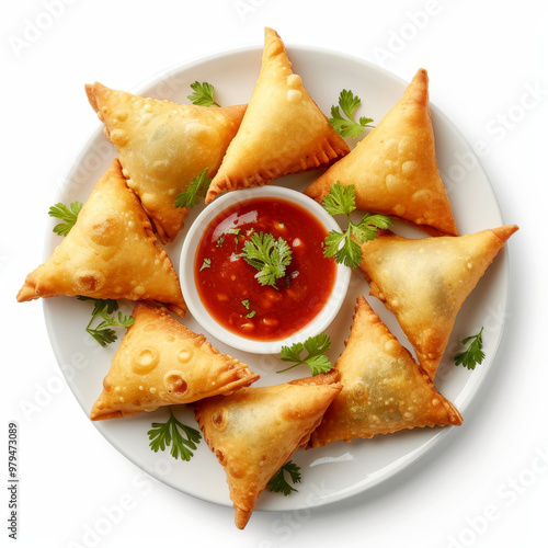 Top view of delicious paneer tikka with fresh herbs and dip on a white plate