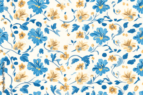 Seamless tilable floral pattern with blue and yellow flowers and geometric shapes on white background